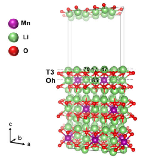 圖 3. LMO (001) 表面的平板模型。 表面四面體鋰層標記為 T3,次表面八面體鋰層標記為 Oh。提取的鋰標有識別號。