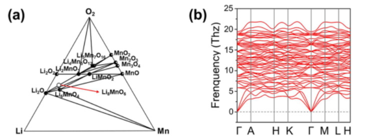 6的熱力學和動態穩定性。 (a) Li-Mn-O a t T = 0 K 的計算相圖。(b) 基電子態 Li