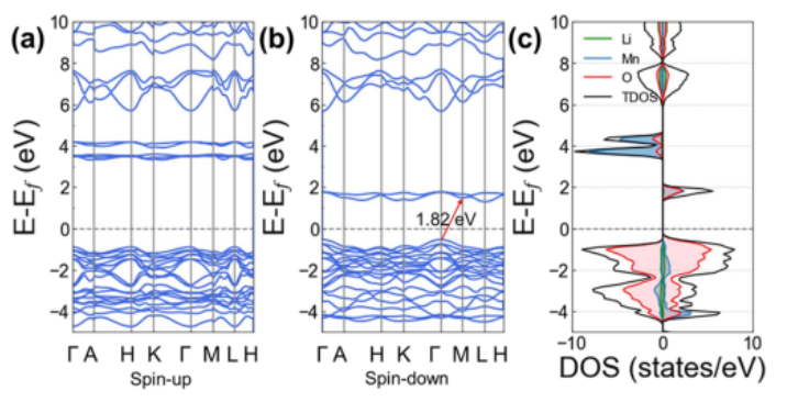圖 6. PBE+U 的 LMO 電子結構。 (a, b) 帶結構。 (c) 總態密度 (TDOS) 和部分態密度 (PDOS)。 帶能量與費米能級相關,費米能級設置為價帶最大值,如虛線所示。