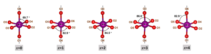 6(x = 0, 1, 2, 3, 4)中 O-Mn-O 鍵的最小鍵角也在圖中突出顯示。