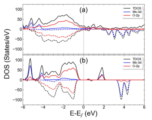 圖 11. Mn 和 O 原子的 PDOS 和 (a) 表面 Li94_x17, 85 和 (b) 超晶胞 Li94_x36, 40 的 TDOS。費米??能級為 0 eV。