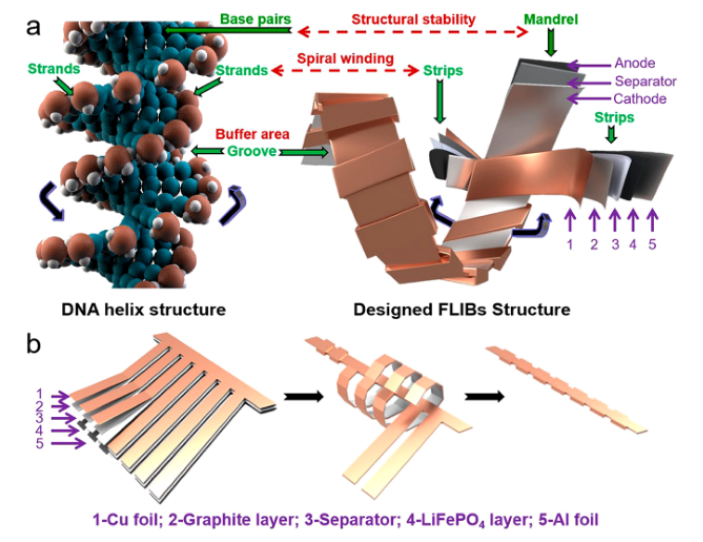 圖 1. 設(shè)計的電池結(jié)構(gòu)和制造過程示意圖。 (a) DNA 螺旋結(jié)構(gòu)和受螺旋啟發(fā)的電池設(shè)計。 條帶用于儲能,心軸保持結(jié)構(gòu)穩(wěn)定性。 (b) 在螺旋 FLIB 制造過程中,首先將多層電極切割成設(shè)計的形狀,然后將延伸的條帶纏繞在芯軸上以形成能量堆棧。