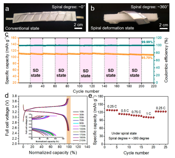 圖 2. 靜態(tài)模式下電池的電化學性能。(a)常規(guī)狀態(tài)和(b)設(shè)計電池的螺旋狀態(tài)的數(shù)碼照片。 (c) 通過每 20 次循環(huán)改變狀態(tài)(長度,180 ± 5 mm;寬度,20 ± 5 mm;螺旋度,360°)獲得的電池在 220 次循環(huán)后的容量保持率和庫侖效率。 (d) 不同循環(huán)數(shù)下的恒電流充電/放電 (GCD) 曲線。 (e) 靜態(tài)螺旋配置中電流密度范圍為 0.25 至 1 C 的電池的倍率性能。