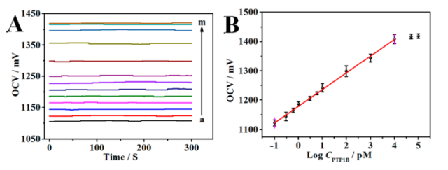 5pM。 (B) OCV 值對 PTP1B 濃度對數的依賴性。