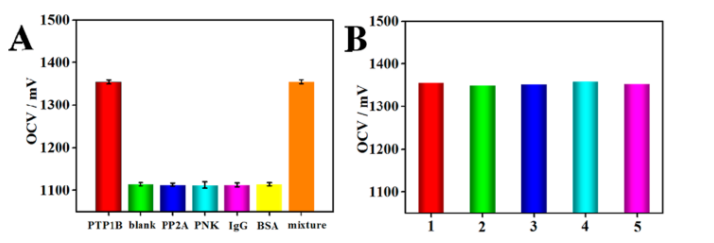 圖 6. (A) 構建的自供電 PEC 傳感器的選擇性。 PTP1B,1納米; 干擾物,100 nM; 以及含有 PTP1B (1 nM) 和四種干擾物(每種干擾物,100 nM)的混合物。 (B) 自供電 PEC 傳感器在同一批次中的重現性。 PTP1B,1納米。