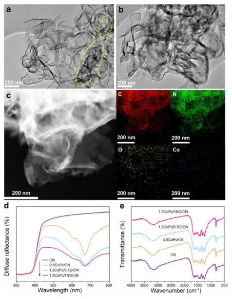 圖1. (a) 0.5CoPc/CN、(b) 1.5CoPc/1NG/CN的TEM圖像。(c) 1.5CoPc/1NG/CN的HAADF-STEM圖像,以及元素C、N、O和Co對應的EDX映射圖像。(d) CN、0.5CoPc/CN、1.2CoPc/0.5G/CN和1.5CoPc/1NG/CN的UV-Vis DRS。(e) CN、0.5CoPc/CN、1.2CoPc/0.5G/CN和1.5CoPc/1NG/CN的FT-IR光譜。