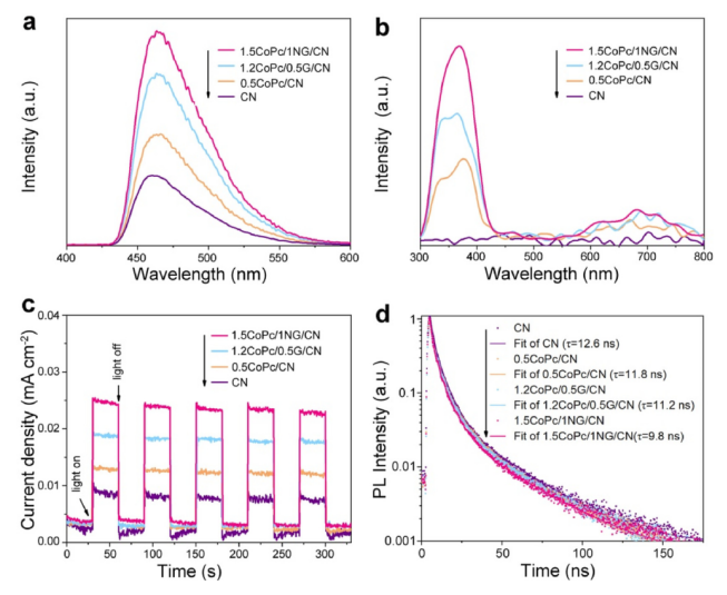 2氣氛下的SPS響應,(c)瞬態光電流,(d) CN、0.5CoPc/CN、1.2CoPc/0.5G/CN和1.5CoPc/1NG/CN的時間分辨PL (TR-PL)光譜。