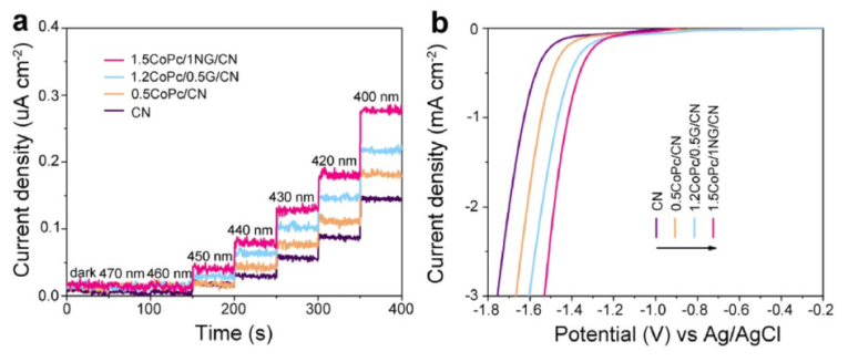 4納米片(CoPc/NG/CN)異質結。相比于僅含CN時,優化的CoPc/NG/CN光催化劑在O