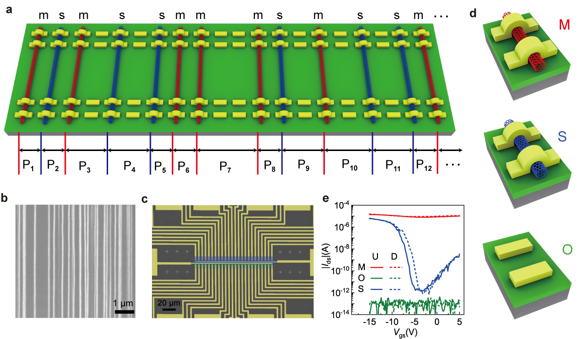 北京大學電子學院、北京大學碳基電子學研究中心、納米器件物理與化學教育部重點實驗室、納光電子前沿科學中心的張志勇-彭練矛聯合課題組首次提出了孿生物理不可克隆功能(PUFs)的概念,在化學氣相沉積法生長的碳管陣列上成功制備了孿生PUFs,并演示了其在加密通訊上的應用。碳管陣列在垂直于生長方向具有手性、位置隨機性,而在平行方向具有一致性。在這種碳管陣列上制備的場效應晶體管具有三種不同的電學性質,即開路(0,無碳管)、半導體(S, 純半導體碳管S)和金屬(M,至少一根金屬碳管)。由于碳管的位置和手性是由隨機成核和隨機催化劑分布決定,所以晶體管將隨機地顯示O、S和M類型,其順序既不可預測,也不可克隆。碳管在生長方向可以保持數百微米長度的性質不變,故在同一個碳管陣列上平行制造的兩排晶體管陣列會顯示出具有相同順序的 O、S 和 M 類型,因此可以實現同時制備兩個相同的孿生PUFs。對于一般的非孿生PUFs,在加密通訊前,需要把密鑰存儲在非易失性存儲器,再分享給參與通訊的其他人,故降低了安全性,而孿生PUFs無需提前提取密鑰,從而大大提高了安全性。
