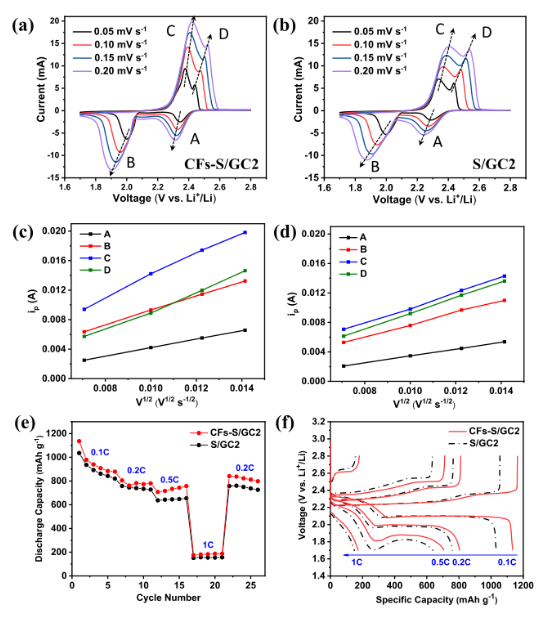圖5. (a) CFs-S/GC2和(b) S/GC2陰極在速率分別為0.05、0.10、0.15和0.20 mV S-l時的CV曲線。以及(c) CFs-S/GC2和(d) S/GC2陰極的掃描速率vl/2的平方根與峰值電流Ip之間的對應關系。(e, f) CFs-S/GC2和S/GC2陰極在0.1C、0.2C、0.5C和1C時的倍率性能,以及每個循環的放電/充電曲線。