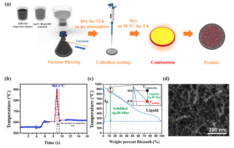 圖2 錨定在CNTs的Ag-Bi 納米顆粒的燃燒法原理。(a)由Ag2O、Bi粉末和硝化纖維素組成的前驅體的制備,以及通過燃燒法制備的碳納米管上活性材料的產物。(b)由燃燒引起的熱化學反應的實時溫度變化,導致1 s內的快速加熱-冷卻。(c) Ag-Bi合金的二元相圖。(d)燃燒合成后Ag-Bi NP錨定CNT網絡的SEM圖像。
