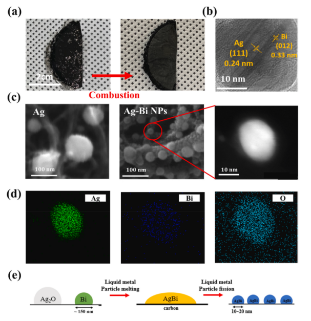 圖1. 燃燒驅動合成Ag - Bi雙金屬納米顆粒(NP)錨定碳納米管以及Ag和Bi在單一顆粒中均勻混合相的路線示意圖。