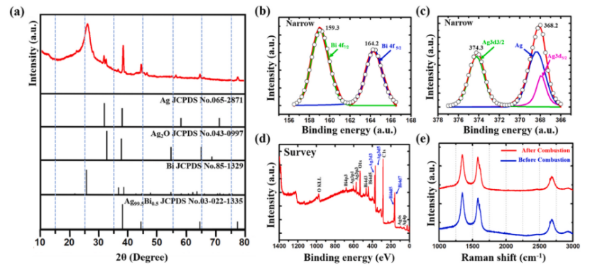 圖5 錨定在CNTs的Ag-Bi 納米顆粒的物理化學表征。(a) Ag-Bi的XRD, (b) Bi, (c) Ag在CNTs上的XPS譜圖,(d) Ag - Bi雙金屬納米結構的測量分析。(e)燃燒合成前后Ag2O-Bi粉末和Ag-Bi雙金屬納米結構的拉曼光譜。