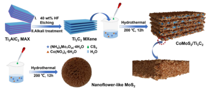 圖1. 合成Ti3C2 MXene、CoMoS2和CoMoS2/Ti3C2的示意圖。