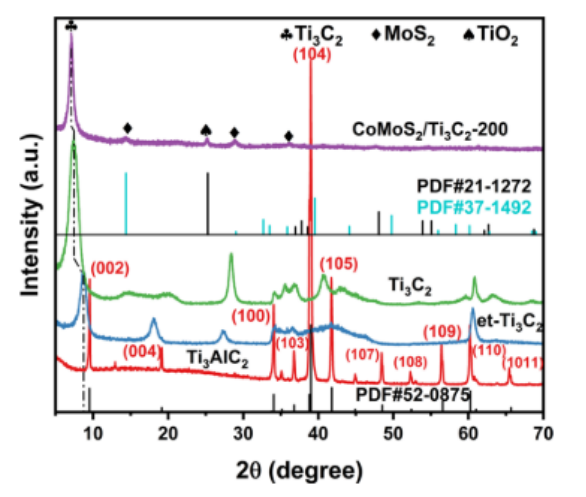 圖2 Ti3AlC2, et-Ti3C2, Ti3C2和CoMoS2/ Ti3C2-200的XRD譜圖。