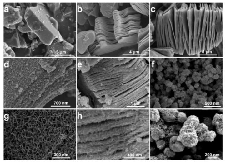 圖3. (a) Ti3AlC2 MAX, (b) et-Ti3C2, (c) Ti3C2和(d,g) CoMoS2/Ti3C2-200和(f,i) CoMoS2樣品的俯視圖和(e,h)側視圖的SEM圖像。