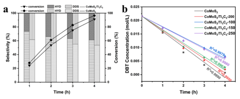 圖8. 制備樣品的催化性能。(a) CoMoS2和CoMoS2/Ti3C2-200上的DBT轉化率和HYD/DDS選擇性。(b) DBT濃度數據與CoMoS2、CoMoS2/Ti3C2-200、CoMoS2/Ti3C2-100、CoMoS2/Ti3C2-150和CoMoS2/Ti3C2-250反應時間的關系。