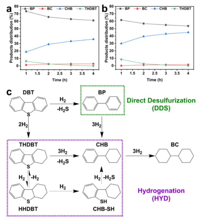 圖9. (a) CoMoS2/Ti3C2-200和(b) CoMoS2催化的產物分布數據vs反應時間。(c) DBT HDS反應步驟。