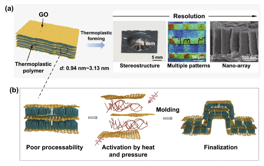 Figure 1.(a) Pi-GOS 的熱塑性成型過程,從平面薄膜到從宏觀到納米尺度的不同壓紋結構。(b)熱塑性機制示意圖,包括 GO 片材的滑動和聚合物鏈在壓力和加熱下的活化。