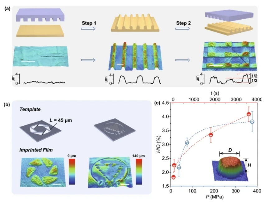 Figure 5. (a)表示從平面到微圖案階段的多壓印工藝。比例尺,50μm。(b)通過微壓印在Pi-GOS上的表面圖案:由三角形形成的簡單六邊形(左),ZJU標志的浮雕(右)。比例尺,50μm(左),2 mm(右)。(c)高徑比與壓力和時間的關系曲線。虛線對應擬合結果,點代表實驗結果(誤差線基于平均值的標準誤差)。