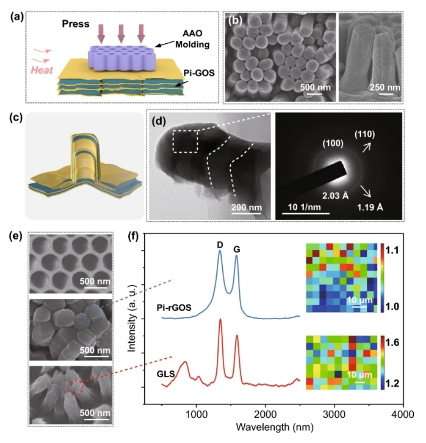 Figure 6. (a)具有通孔AAO模板的熱納米壓印工藝示意圖。(b)SEM 觀察,(c)結構表示和(d)納米棒外部和內部制造的 TEM 圖像。(e) AAO 模板(上)、印跡 Pi-rGOS 納米柱(中)和熱還原 GLS 納米柱(下)的 SEM 圖像。(f)Pi-rGOS 和 GLS 的拉曼光譜。插圖是通過考慮 D 和 G 帶的強度比對 Pi-rGOS(上)和 GLS(下)的拉曼映射分析。