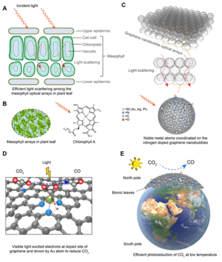 Figure 1. (A) 植物葉片中的光吸收和由葉綠素分子誘導的光還原示意圖,其中金屬原子與氮配位。(B, C) 具有仿生巨型結構的石墨烯納米氣泡可以像植物葉子一樣衍射和吸收光。吸收的光可以觸發氮配位金屬位點的光還原。(D) 貴金屬原子配位在石墨烯納米氣泡中的氮摻雜位點和可見光下CO2的光還原。(E) 在低溫區域(如南極和北極)使用超材料的藍圖,這些區域就像植物一樣可以減少由太陽輻射驅動的CO2 。