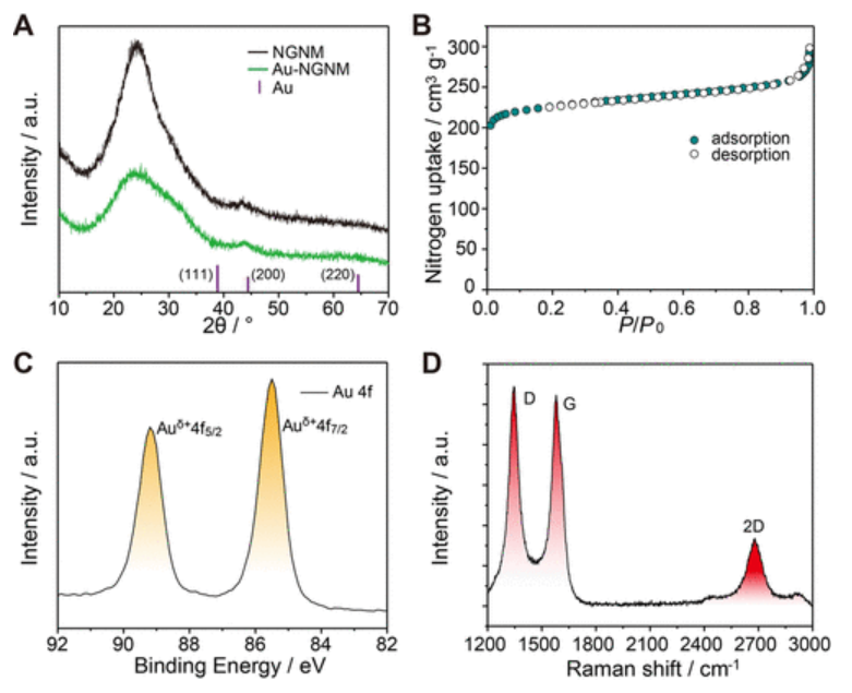 Figure 3. (A) Au-NGNM 和 NGNM 的 PXRD 模式。(B) Au-NGNM 的 N 2吸收等溫線。(C) Au-NGNM 中 Au 4f 的 XPS 光譜。(D) 在 5 W 激光功率下獲得的 NGNM 拉曼光譜。