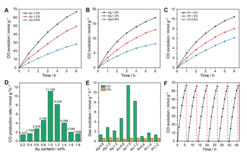 Figure 6. (A-C)在 M-NGNM 上將CO 2光催化還原為 CO。(D, E)金屬單原子負載量下M-NGNM上CO 2的光催化還原性能。(F) Au-NGNM 36 h循環光催化CO 2還原性能。