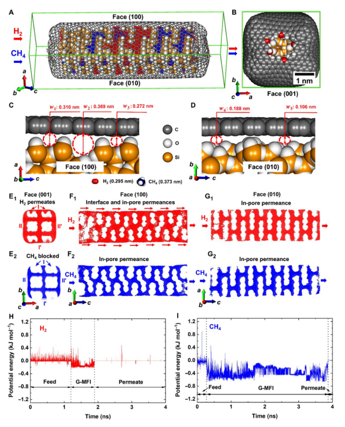 2 ) 投射到 (100) 面的軌跡。紅色箭頭顯示 H2在石墨烯-MFI 界面空間的滲透。CH4的藍(lán)色軌跡顯示CH4滲透通過孔隙,但不通過石墨烯-MFI 界面空間。( G