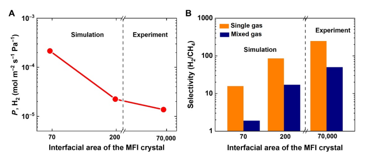Figure 5. G-MFI 滲透性和選擇性。( A ) H2滲透率與 MFI 晶體界面表面積的關(guān)系曲線,由模擬和實(shí)驗(yàn)確定。( B ) H2/CH4選擇性與 MFI 晶體界面表面積的關(guān)系圖,由單一氣體和混合氣體的模擬和實(shí)驗(yàn)確定。界面面積等于模擬用MFI晶體和實(shí)驗(yàn)用MFI顆粒的幾何外部面積。