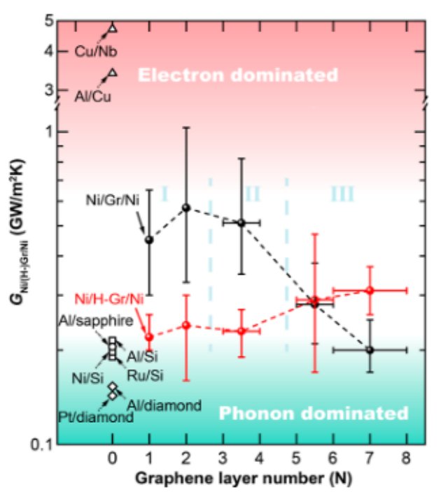 圖 3. Ni/Gr/Ni、GNi/Gr/Ni(黑球)和 Ni/H-Gr/Ni、GNi/H-Gr/Ni(紅球)的 ITC 作為 N 的函數。金屬的典型電子主導的金屬-金屬結構 (Al-Cu,Cu-Nb) 和典型的聲子主導的金屬-電介質的 ITC。