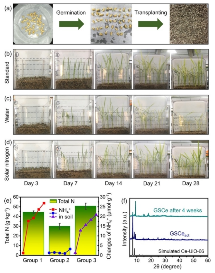 Figure 5. GSCe光催化劑作為太陽能氮肥的評價。a) 水稻種子的發芽和移栽;用 b) 標準氮肥溶液、c) 純水和 d) 太陽能氮肥溶液灌溉的水稻幼苗圖像;e) 水稻幼苗全氮及土壤NH