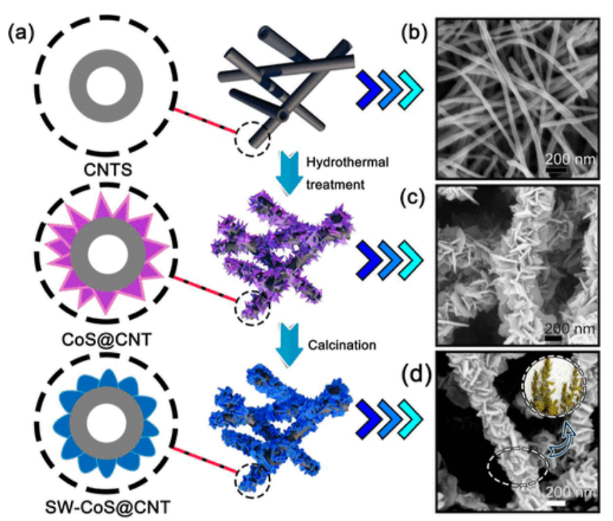 Figure 1. 海藻狀催化劑結(jié)構(gòu)的圖解和表征圖像。 (a) 左欄顯示材料中單管的橫截面圖,右欄顯示樣品在不同制備階段的微觀結(jié)構(gòu)。 (b) 具有光滑表面和 3D 網(wǎng)絡(luò)結(jié)構(gòu)的 CNTS 的 SEM 圖像。 (c) CoS@CNT 的 SEM 圖像,顯示出強(qiáng)烈增加的直徑和尖銳的納米板覆蓋表面。 (d) SW-CoS@CNT 的 SEM,其具有類似海藻的形態(tài),具有鈍的納米板邊緣,插圖是在中國(guó)沿海地區(qū)廣泛分布的常見馬尾藻的圖片。