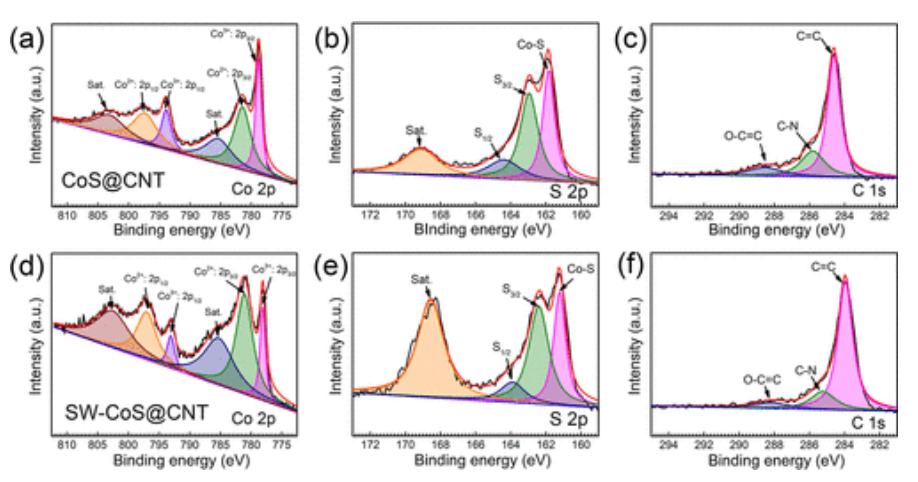 Figure 3. CoS@CNT和SW-CoS@CNT的XPS精細(xì)光譜; (a) CoS@CNT的Co 2p光譜; (b) CoS@CNT的S 2p光譜; (c) CoS@CNT的C 1s光譜; (d) SW-CoS@CNT的Co 2p光譜; (e) SW-CoS@CNT 的 S 2p 光譜; (f) SW-CoS@CNT 的 C 1s 光譜。