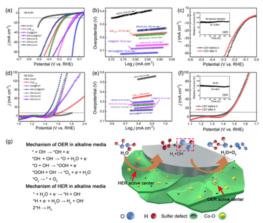 Figure 4. 材料電化學(xué)性能和穩(wěn)定性測(cè)試及催化結(jié)構(gòu)示意圖(a)堿性介質(zhì)中的HER LSV曲線。 (b) 堿性介質(zhì)中的 HER Tafel 斜率。 (c) SW-CoS@CNT 在電流 i-t 前后的 HER LSV 曲線,插圖是電流 i-t 曲線。 (d) 堿性介質(zhì)中的 OER LSV 曲線。 (e) 堿性介質(zhì)中的 OER Tafel 斜坡。 (f) SW-CoS@CNT 在安培 i-t 前后的 OER LSV 曲線,插圖是安培 i-t 曲線。 (g) SW-CoS@CNT 在堿性介質(zhì)中 HER 和 OER 的機(jī)理和催化結(jié)構(gòu)示意圖。