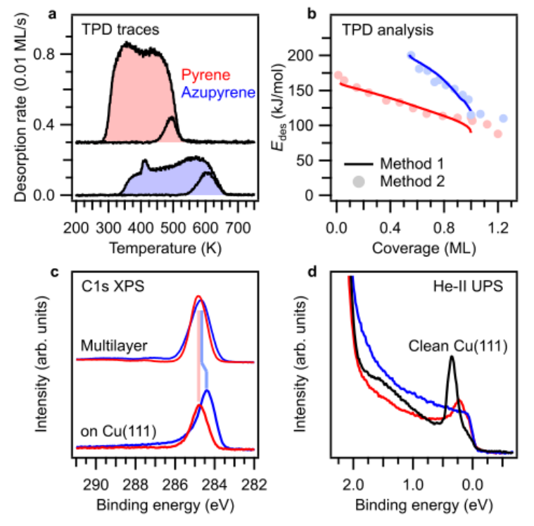 圖4。TPD和光電發射(XPS,UPS)數據表明模型缺陷和金屬之間的結合增強。(a)初始單層覆蓋和較低初始覆蓋的TPD痕量的Azupyrene和Pyrene。分析中使用的中間覆蓋層的TPD數據見補充圖S6。(b)通過使用兩種不同方法分析TPD數據獲得的覆蓋范圍相關解吸能量。(C)Cu(111)上多層膜和單層膜的C 1s光電子能譜。兩者之間的相對位移用陰影線標出。Azupyrene單層峰的不對稱性表明與表面金屬態的雜化。(d)清潔表面(黑色)和芘和芘的單層的He-II UP光譜。表面態的消失(清潔表面上的結合能為0.3 eV)顯示了對氮雜芘的更強的相互作用。