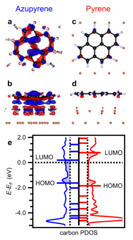 圖6. 基于DFT的成鍵分析顯示電子從Cu(111)表面轉移到未被占據的Azupyrene的LUMO中,并且芘沒有電荷轉移。(a d)氮雜芘(a,b)和芘(c,d)的電荷密度差異圖。所有圖的等值面值都是0.002e