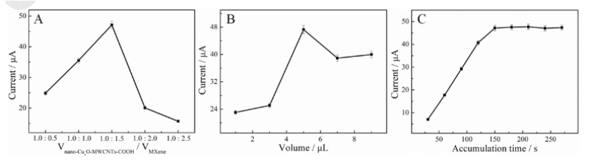 圖5 (A) nano-CuxOMWCNTs-COOH與MXene組成比例的影響。(B) nano-CuxOMWCNTs-COOH/MXene在GCE上的包覆量。(C) DPV對10.0 μM BN氧化峰電流的累積時間。