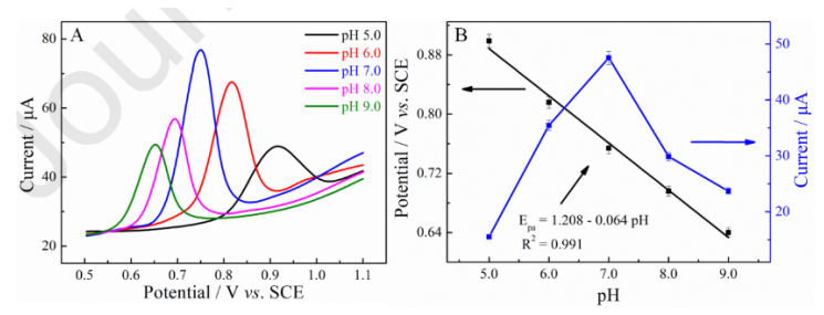 圖6. (A) nano-CuxOMWCNTs-COOH/MXene/GCE在不同pH值的PBS中測定10.0 μM BN的DPV曲線。(B) pH值對Epa和Ipa的影響。