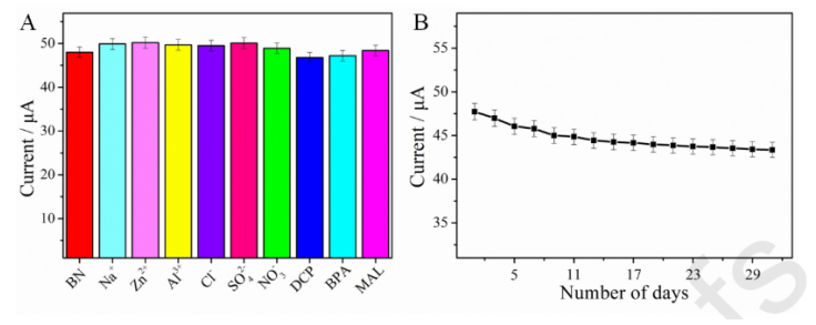 圖9 (A)各種干擾下對BN檢測的影響。(B) nano-CuxO-MWCNTs-COOH/MXene/GCE的穩(wěn)定性。