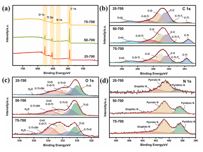 圖2 (a) PCM-25-700, (b) PCM-50-700, (c) PCM-75-700, (d) PCM-50-700的TEM圖像,(e, f) PCM-50-700的HRTEM圖像,(g)具有代表性的EDS映射的STEM圖像,表明PCM-50-700的c, O, Ti, f和N元素的分布。