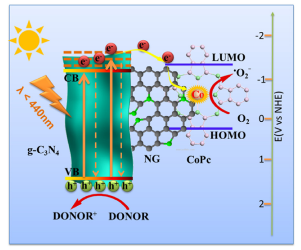 4納米片(CoPc/NG/CN)異質結。相比于僅含CN時,優化的CoPc/NG/CN光催化劑在O