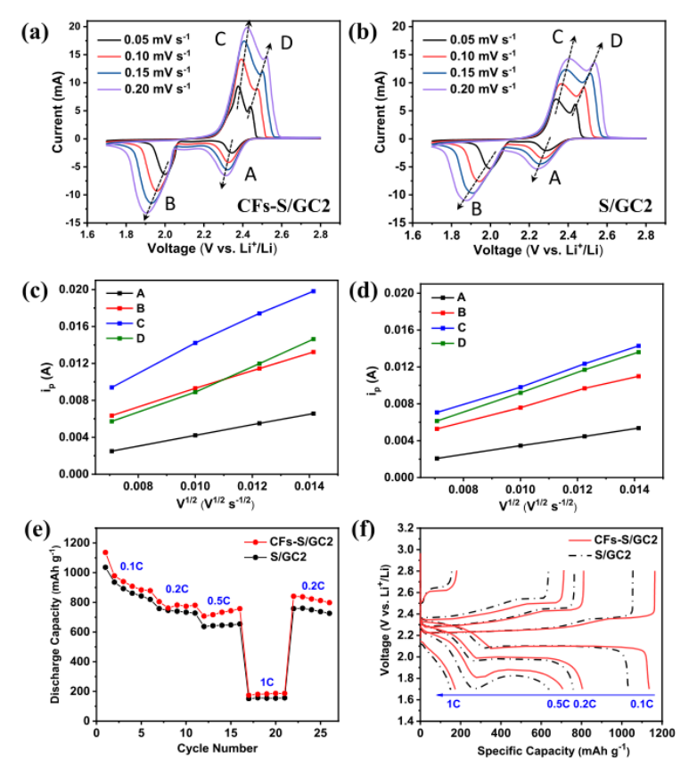 -l時的CV曲線。以及(c) CFs-S/GC2和(d) S/GC2陰極的掃描速率v