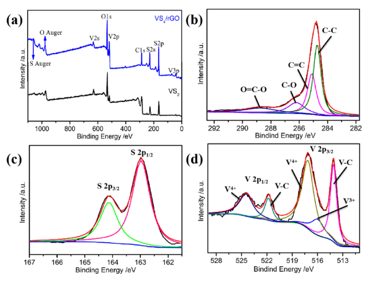 4的(b) C 1s、(c) S 2p和(d) V 2p核級及對應的退卷積光譜。