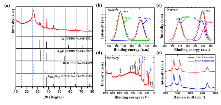 圖5 錨定在CNTs的Ag-Bi 納米顆粒的物理化學表征。(a) Ag-Bi的XRD, (b) Bi, (c) Ag在CNTs上的XPS譜圖,(d) Ag - Bi雙金屬納米結構的測量分析。(e)燃燒合成前后Ag