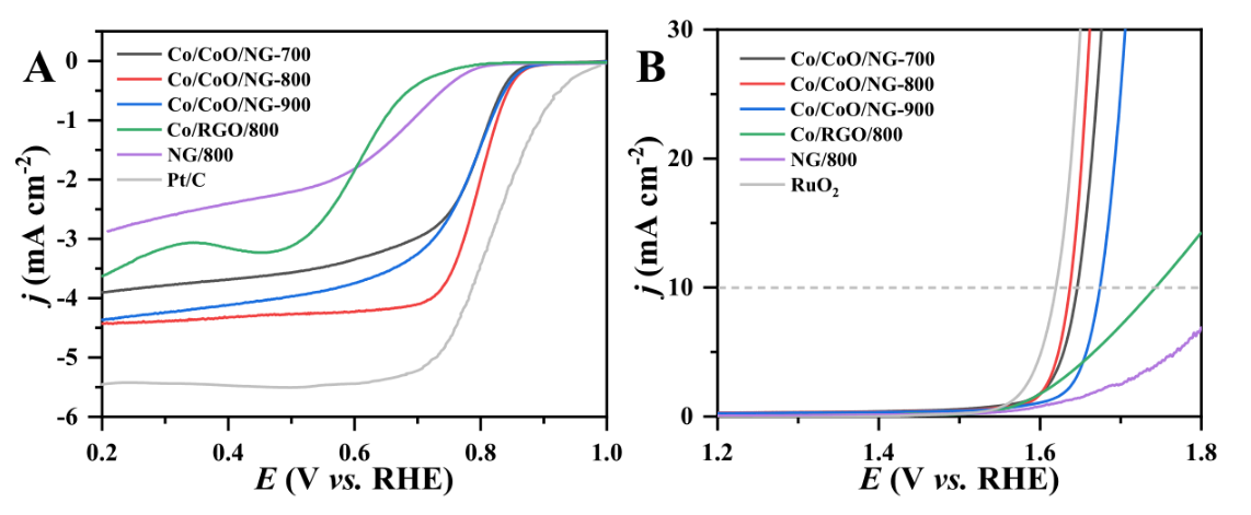 圖4. (A) Co/CoO/NG-T、Co/RGO/800、NG/800和Pt/C催化劑在O