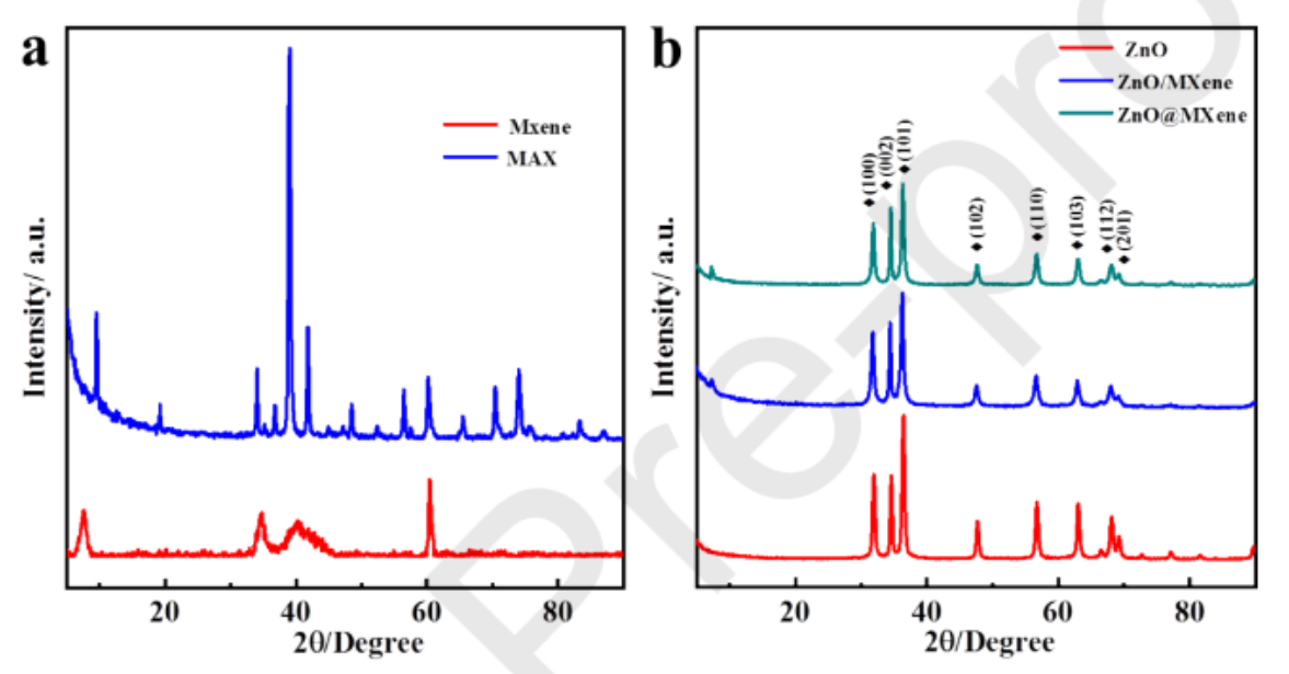 圖3 球形MAX和MXene(a)、ZnO、ZnO/MXene和ZnO@MXene(b)的XRD圖。
