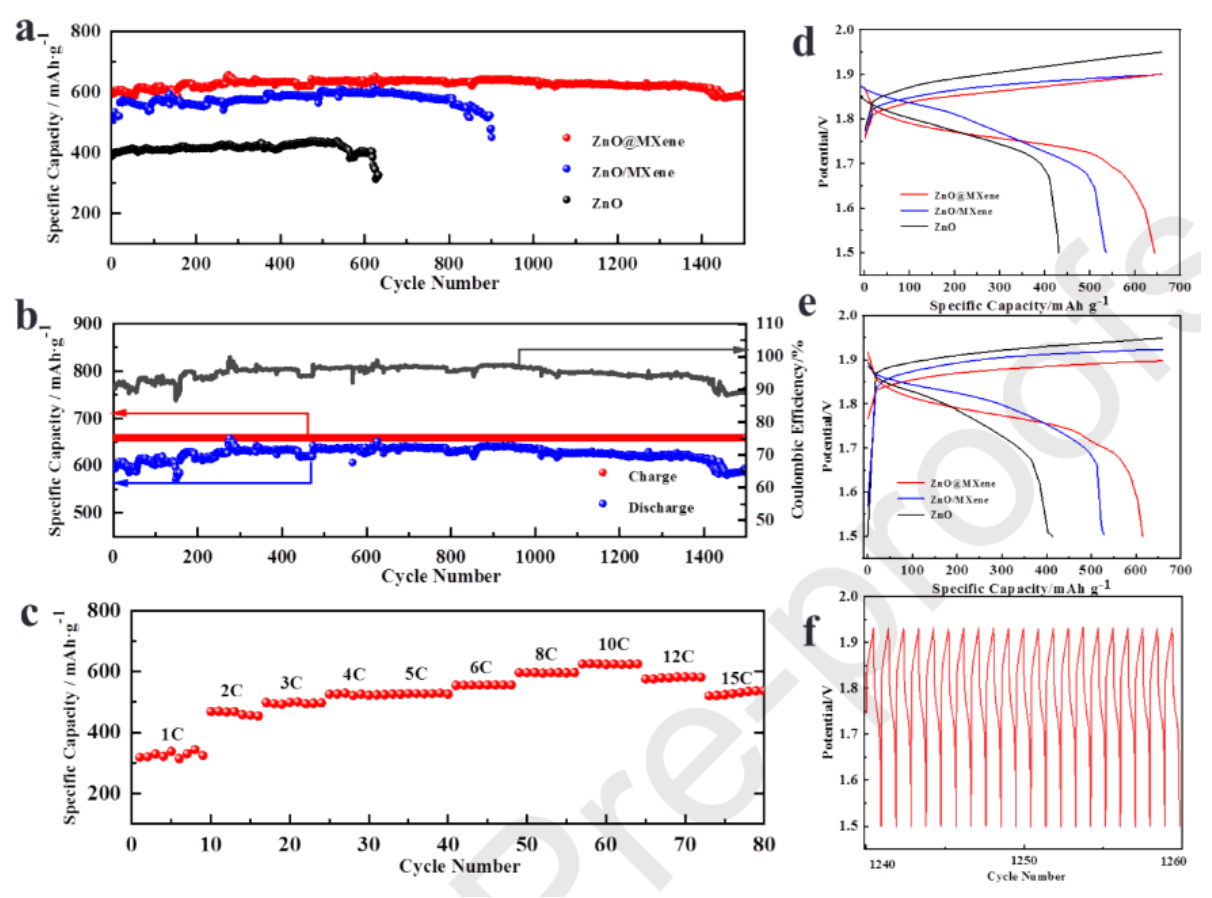圖7 ZnO, ZnO/MXene和ZnO@MXene的循環曲線(a),庫侖效率(b), ZnO@MXene的速率性能(c), ZnO, ZnO/MXene和ZnO@MXene在第100和600個循環時的充放電電壓曲線(d,e), ZnO/MXene在1240和1260個循環時的電壓-循環數(f)。