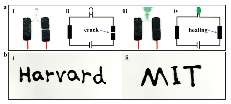 Figure 2. a) 包含可修復 MXene 水凝膠和綠色 LED 指示燈的串聯電路:i) 完全分叉和 ii) 電路的相應示意圖。iii) 自愈式和 iv) 相應的電路原理圖。b) MXene 水凝膠的可注射特性:MXene 水凝膠可以很好地擠出來寫 i) “Harvard”和 ii) “MIT”。