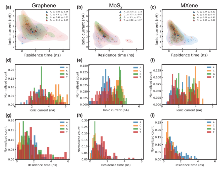圖2、(a-c)計算石墨烯、 MoS2和 MXene 納米孔的4個 DNA 堿基的停留時間和離子電流。每個數據點是16個基地 IC 和停留時間在每個模擬的平均值。我們在石墨烯中進行了270次 ssDNA 模擬,在 MoS2中進行了319次,在 MXene 納米孔中進行了331次。三角形表示每個 DNA 堿基的所有模擬的平均 IC μI 和停留時間 μt。分別通過石墨烯、 MoS2和 MXene 納米孔時,所有四種 DNA 堿基的離子電流(d-f)和停留時間(g-i)的直方圖。